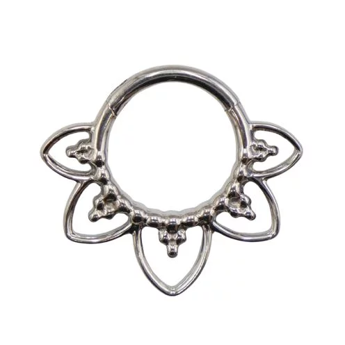 Anneau charnière titane stérile avec motif ornemental multi boules. Élégant et pratique, parfait pour sublimer les piercings septum, hélix ou daith.