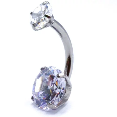 Mettez en valeur vos piercings nombril avec cette banane en titane ASTM-F136. Son design raffiné associe deux strass griffés de 5 mm et 8 mm, pour un bijou élégant et durable, prêt à l’emploi en studio.