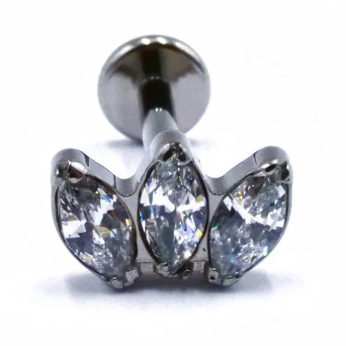 Labret titane stérile filetage interne avec motif Marquise 3 strass resserrés. Un bijou raffiné, brillant et hypoallergénique, idéal pour vos poses pro.